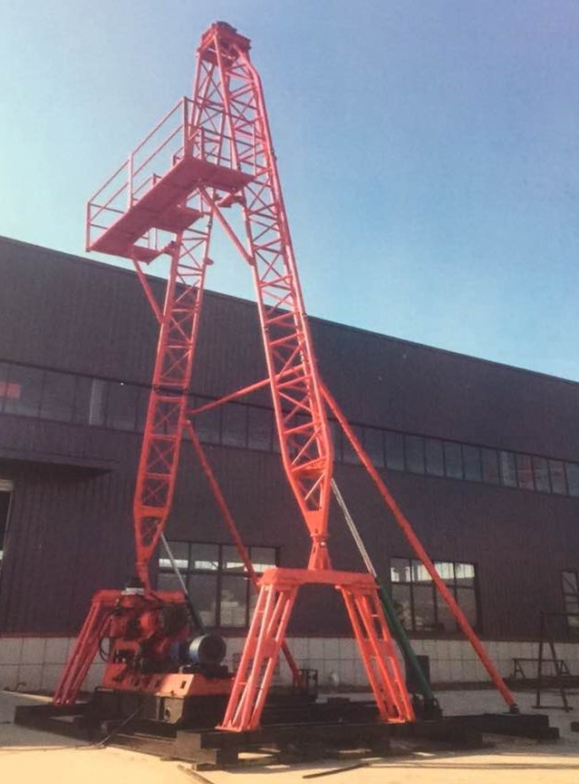 AY-13型鉆塔可配套各種水井鉆機(jī)和XY系列巖心鉆機(jī)垂直、斜孔的施工。其特點(diǎn)為設(shè)計除具有承載能力較大、結(jié)構(gòu)合理、液壓起塔安全可靠,拆裝、搬運(yùn)成本低等特點(diǎn)外,最顯著特點(diǎn)一是塔腳跨度大(5米),操作鉆機(jī)空間大;二是塔身下塔腿連接鉸鏈高于底座底梁2.3米,從而在鉆機(jī)左右擺放時下塔腿不影響鉆機(jī)前后移車,鉆機(jī)動力部分可移至腿支撐內(nèi)襠中。也使得斜孔鉆進(jìn)和提鉆過程中天車、回轉(zhuǎn)、井孔達(dá)到三點(diǎn)一線,大大提高了定向井孔施工的精準(zhǔn)度及安全。