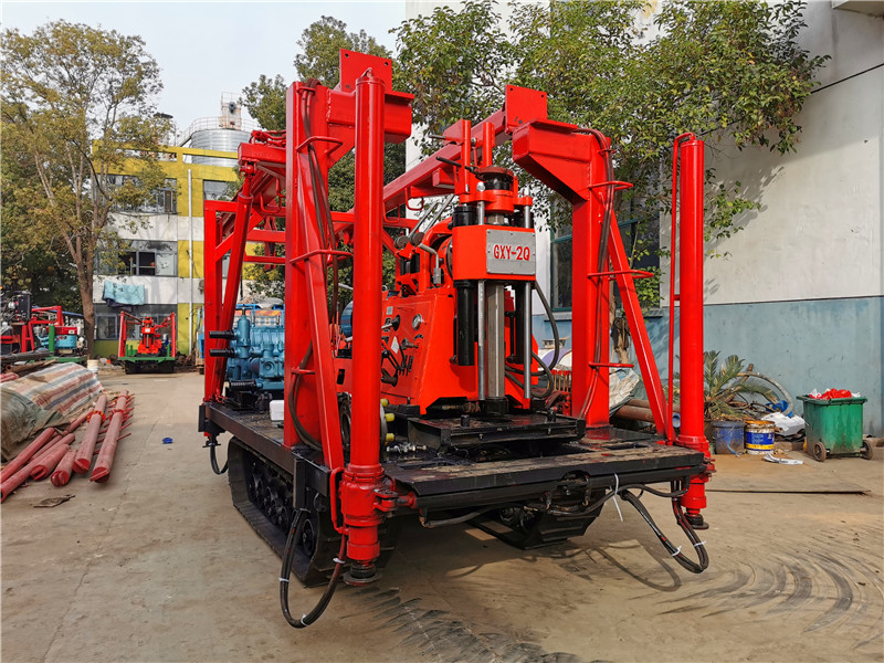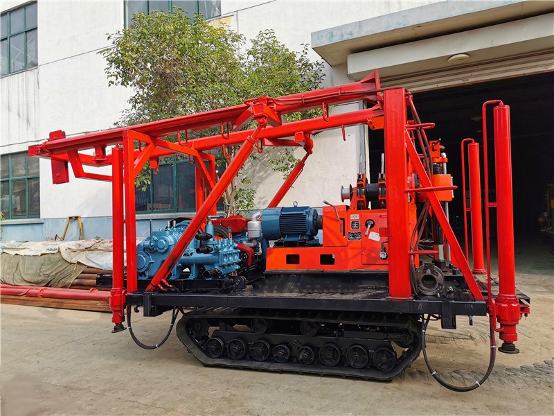 1、鉆機機組由履帶底盤、柴油機、鉆機及柴油機、雙液壓自動起落伸縮式鉆塔(采用雙液壓鉆塔,升高型液壓油缸作支撐,操縱閥控制鉆塔起落、升降,操作省時省力,安全可靠)、泥漿泵組成。