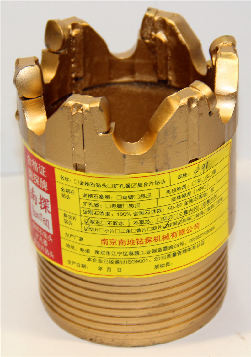 巖心管(單管)取芯復合片鉆頭按照復合片的種類又可以分:普通型復合片鉆頭、加強型復合片鉆頭、球面復合片鉆頭、超強型復合片鉆頭、盔齒型復合片鉆頭、切片復合片鉆頭、小牙復合片鉆頭、小牙螺紋復合片鉆頭、菠蘿復合片鉆頭、外肋骨復合片鉆頭、無內徑跟管復合片鉆頭等許多種,以便于滿足不同地層、砂礫石、巖石的取芯需求。該種鉆頭穩(wěn)定性好,具有使用壽命長、鉆進效率高、低壓中速鉆進、保徑效果好、使用范圍廣和具有優(yōu)越的性價比等特點,可廣泛應用于地質勘探、煤田開采、水利水電施工(水井開發(fā))、地熱孔、公路、鐵路、建筑施工建設的巖石鉆進及巖石抽心取樣驗樁。