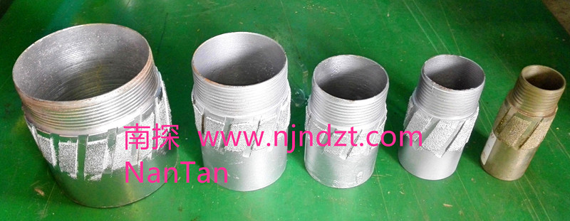 擴(kuò)孔器(電鍍金剛石):是連接在金剛石鉆頭與巖心管之間,起到擴(kuò)大孔徑和修整孔壁保證孔徑不縮小的一種鉆具。由于金剛石鉆頭直徑與巖心管外徑的尺寸相差很小,使孔壁與巖心管之間的間隙更加縮小,使過水受阻,并易造成卡鉆。金剛石擴(kuò)孔器是一短柱狀管體,上下鋼體部分有絲扣分別與鉆頭和巖心管相連,中間部分是覆蓋含金剛石的胎體,其外徑略大于金剛石鉆頭直徑(2毫米左右),胎體側(cè)表面上有過水水槽,使水流通過。在極堅(jiān)硬易磨性的巖層,也有使用兩個和多個擴(kuò)孔器,除一個裝在鉆頭的上部以外,其余的間隔地裝在巖心管之間。